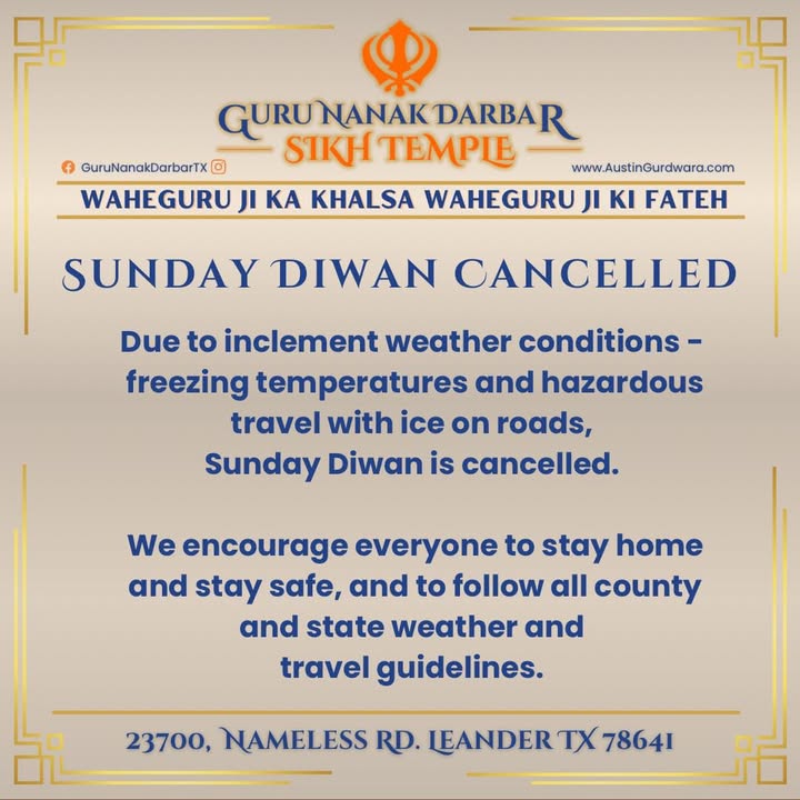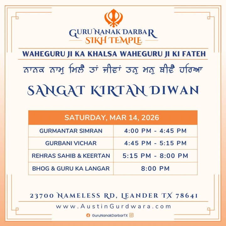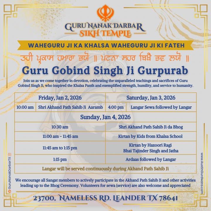 We are excited to announce our daily Nitnem prayers, which will commence at 6 am, as well as our Rehras Saheb Path at 7 pm. We warmly invite each and every one of you to join us in these spiritual gatherings, as your presence is a source of strength and unity within our community.